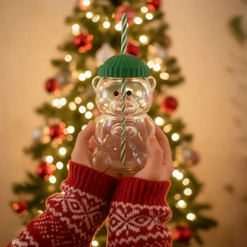 Cute Bear Glass 500ML Green Hat Striped Straw Heat resistant and Durable Suitable for Daily Juice, Milk, Hot Chocolate Beverages