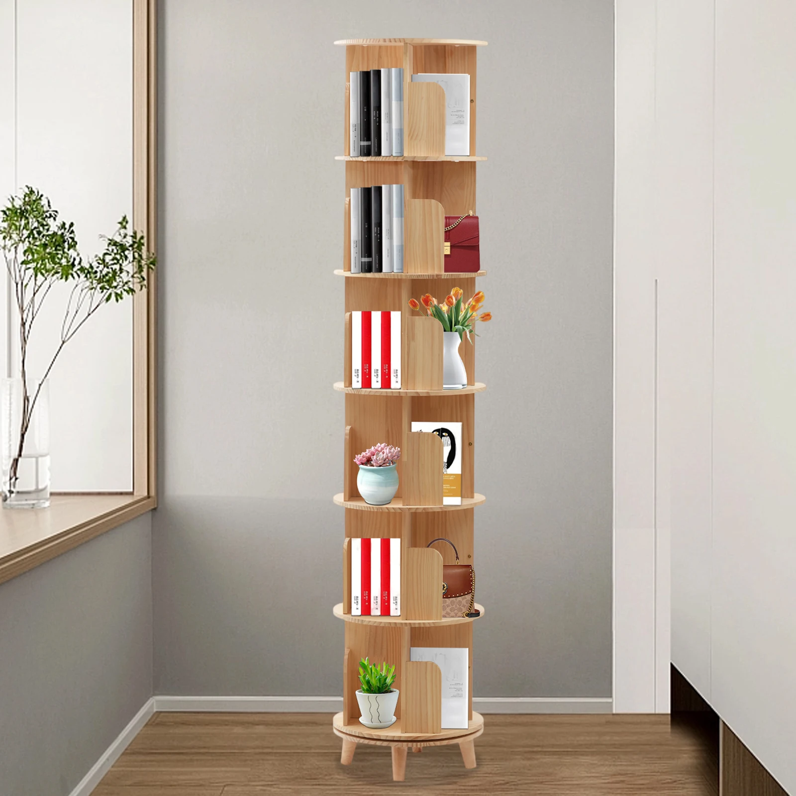 Rotating Bookshelf with Legs, Tall Tower Revolving Standing Book Shelf Wood Bookcase Round Bookshelf for Bedroom Living Room